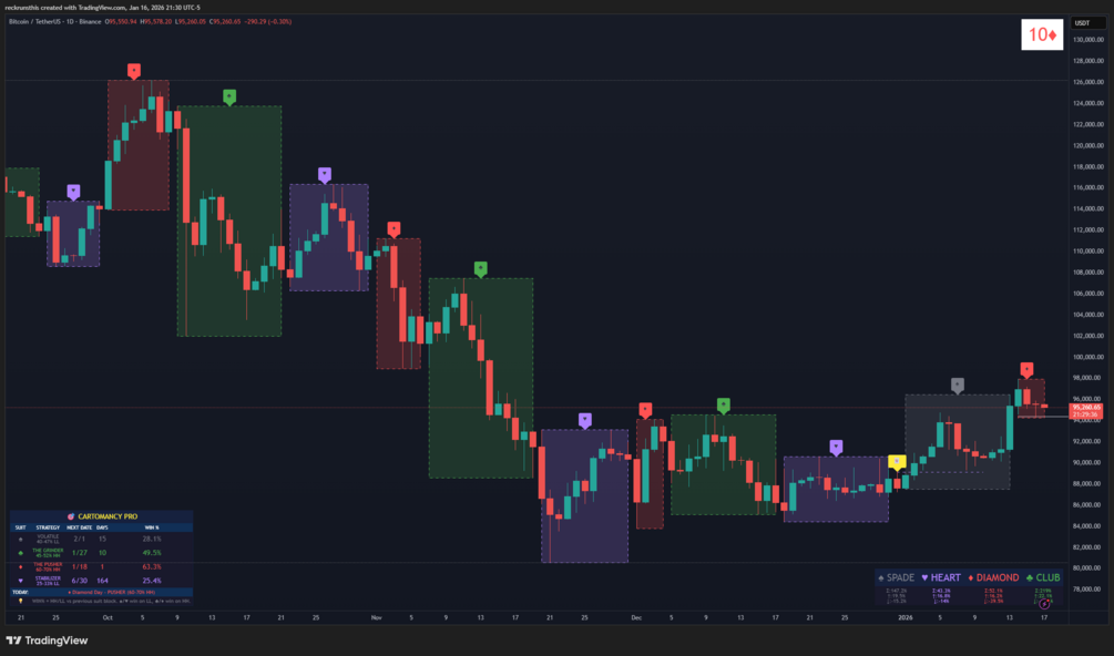 Professional indicator that integrates cartomancy-inspired suit mapping with market pattern analysis. Identifies recurring behaviors such as ♦ periods for higher highs (60–70% probability vs previous suit's high) and Fibonacci retracements at suit transitions (19–30%).